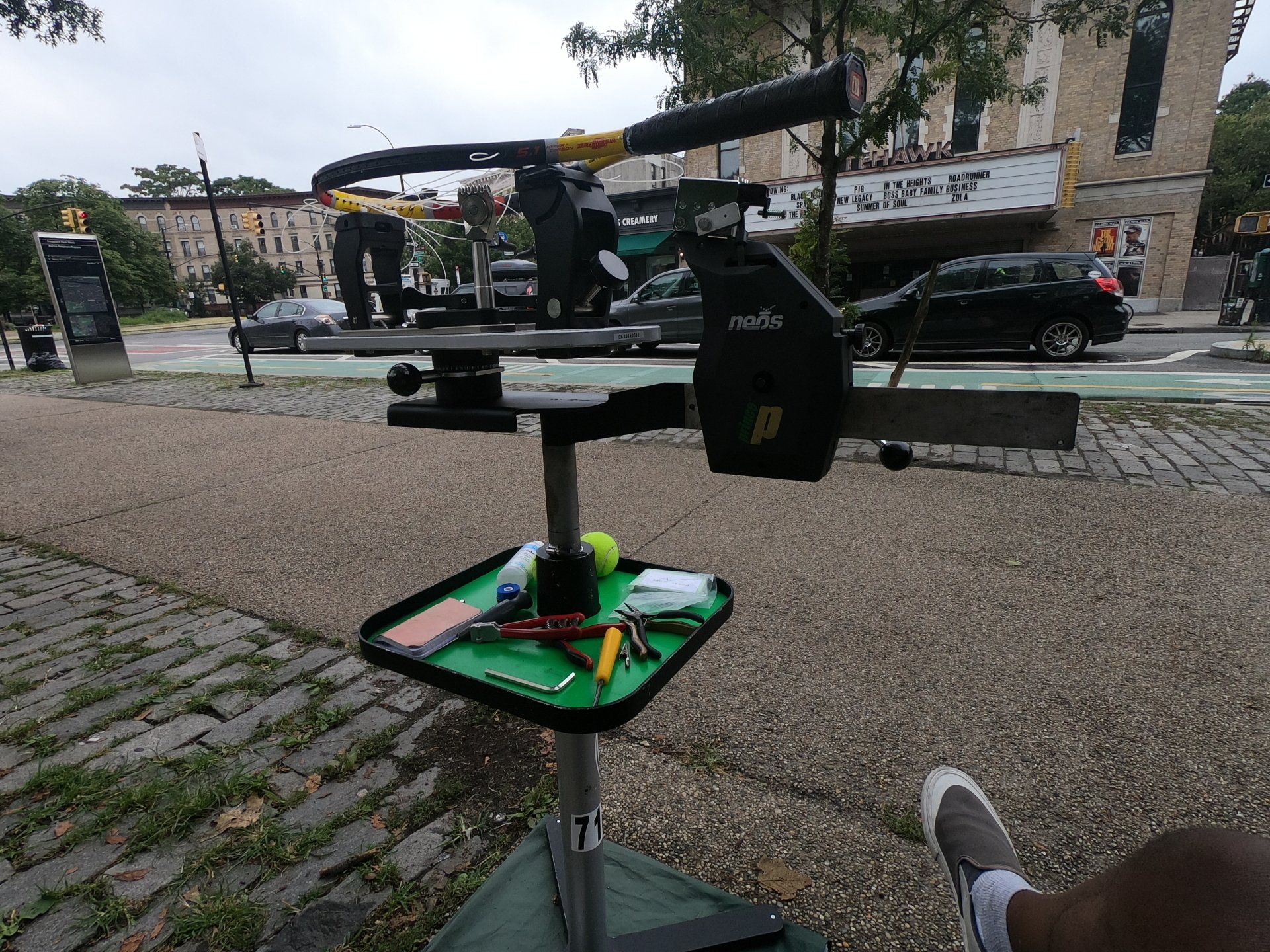 String outside the box. During the warmer months I take a machine to the streets to string while-you-wait.